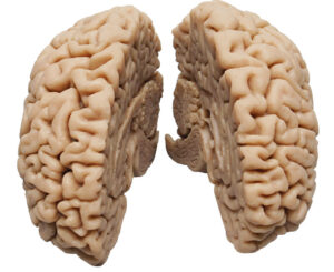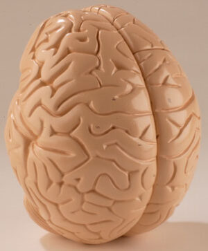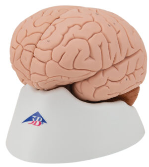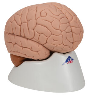 Un lado del modelo muestra la anatomía externa, mientras que el otro lado muestra la anatomía interna del cerebro. El modelo va acompañado de una tarjeta clave de dos caras para ayudar a identificar las partes. La mitad del cerebro viene con un soporte incluido.