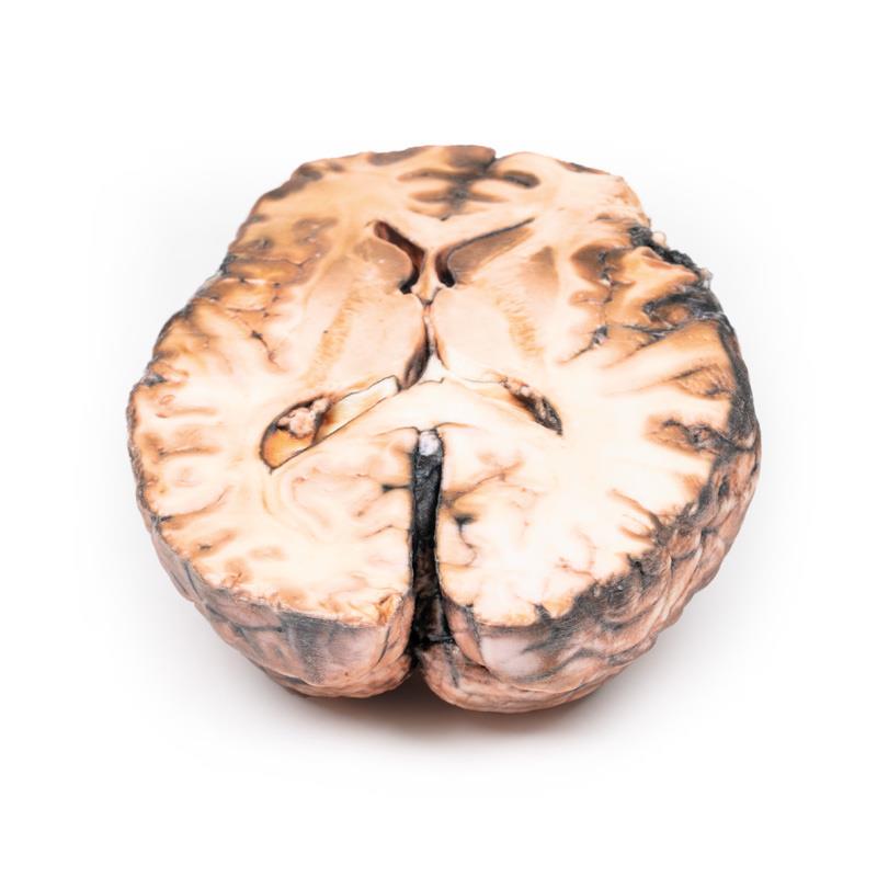 Patología: La muestra muestra la superficie basal del cerebro. Hay un aneurisma sacular de 5 mm de diámetro en la unión de la carótida interna derecha y la arteria comunicante posterior, que se ha roto. Hay sangre subaracnoidea en el área inmediata en la cisterna magna y en la superficie inferior del lóbulo frontal derecho. Hay un aneurisma intacto similar en el lado izquierdo. El lóbulo frontal derecho parece más blando y friable en la parte anterior